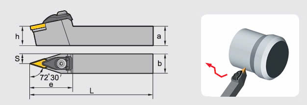 _ Có góc tiếp xúc mũi dao 72°30′ thích hợp tiện biên dạng ngoài phức tạp.