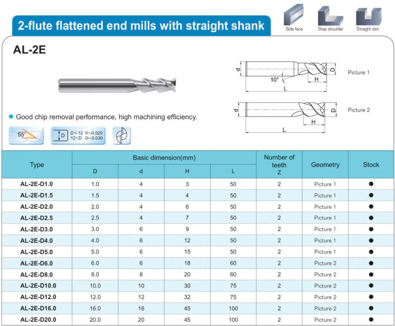 1. Dao phay 2 me cho Nhôm mã AL-2E hãng ZCCCT là dòng sản phẩm nổi bật, được dùng phổ biến trong gia công cơ khí. Nhờ những tính năng như là độ bền cao, tối ưu chi phí, khả năng cắt gọt chính xác và hiệu suất gia công ổn định.
