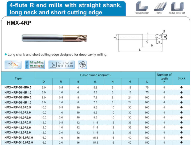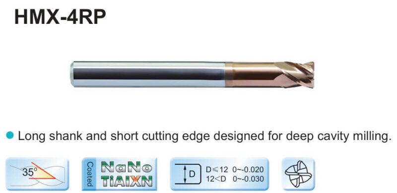 1. Dao phay 4 me bo góc R chuôi dài cho thép ~68HRC mã HMX-4RP hãng ZCCCT là dòng sản phẩm nổi bật, được dùng phổ biến trong gia công cơ khí. Nhờ những tính năng như là độ bền cao, tối ưu chi phí, khả năng cắt gọt chính xác và hiệu suất gia công ổn định. Với đặc điểm chuôi dài và lưỡi cắt có góc R giúp gia công được hốc sâu, rãnh, profile bo góc có bán kính. Lớp phủ NaNo TiAIXN giúp tuổi thọ của dao tốt hơn, gia công được thép lên đến 68HRC.