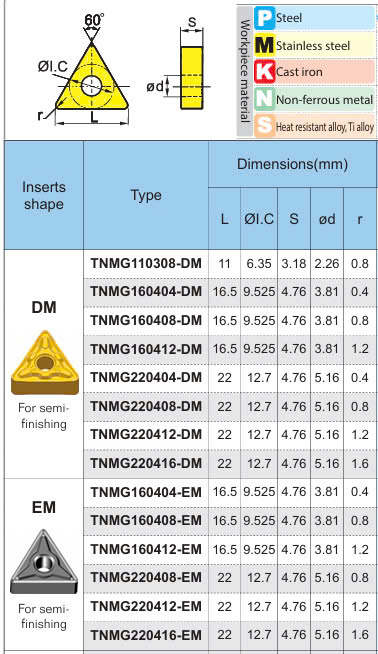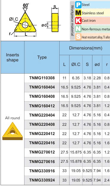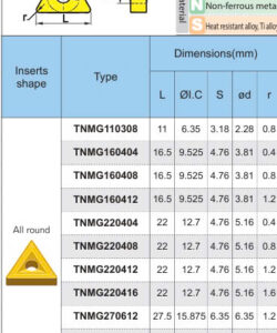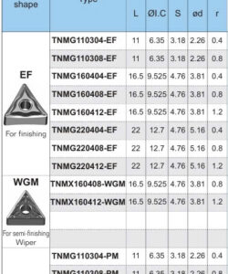 1. Mảnh dao tiện TNMG là một loại mảnh dao được sử dụng cho dao tiện trong các ứng dụng gia công tiện ngoài, tiện lỗ. Được lắp với cán dao có mã: DTGNR/L, PTFNR/L, PTTNR/L, PTGNR/L, PTFNR/L. Đặc điểm chung của loại mảnh này bao gồm:
