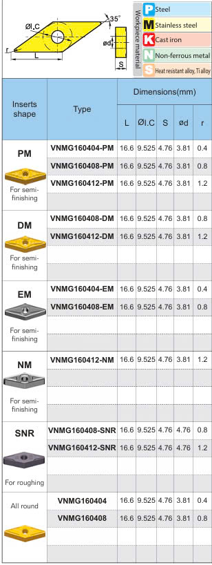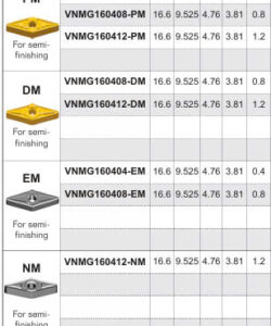 1. Mảnh dao tiện VNMG là một loại mảnh dao được sử dụng cho dao tiện trong các ứng dụng gia công tiện ngoài. Được lắp với cán dao có mã: DVVNN, DVJNR/L. Đặc điểm chung của loại mảnh này bao gồm: